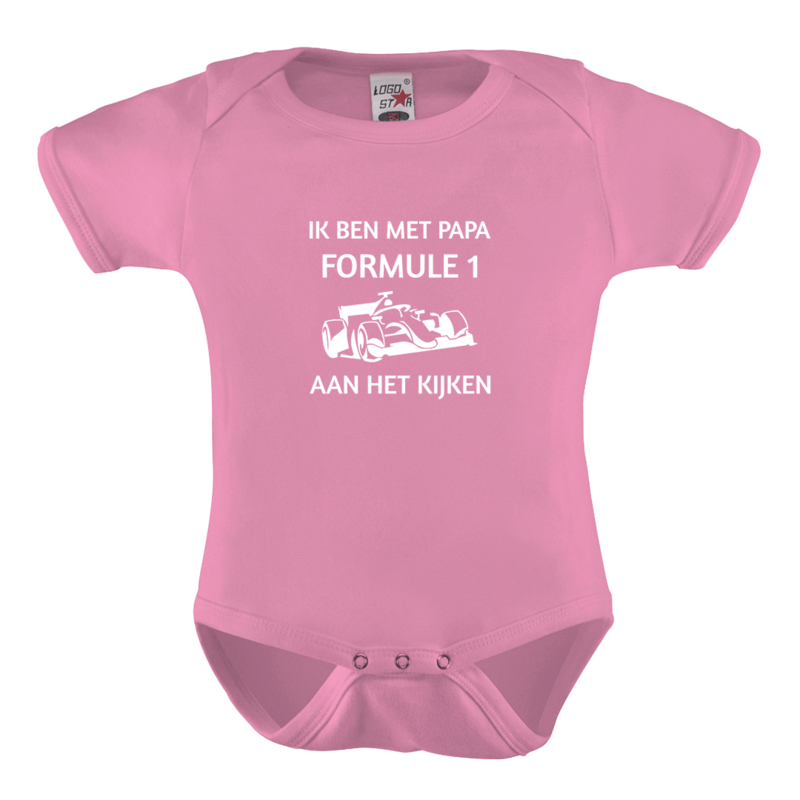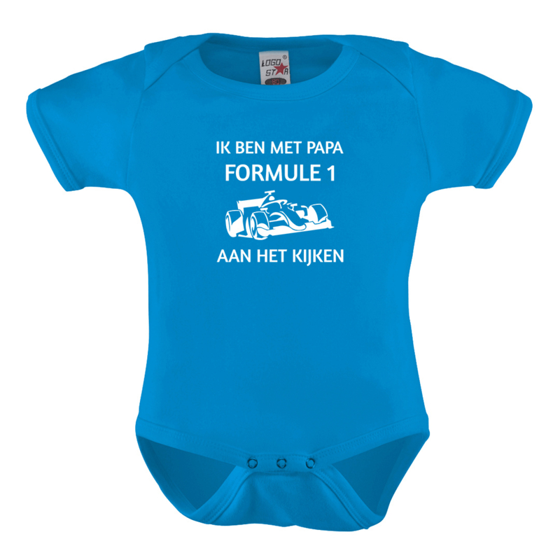 Met deze baby romper met tekst “Ik ben met papa Formule 1 aan het kijken” is meteen duidelijk wie papa’s vaste racebuddy is.