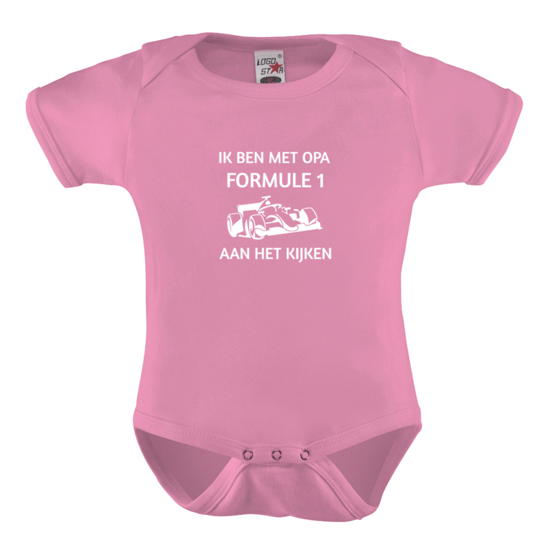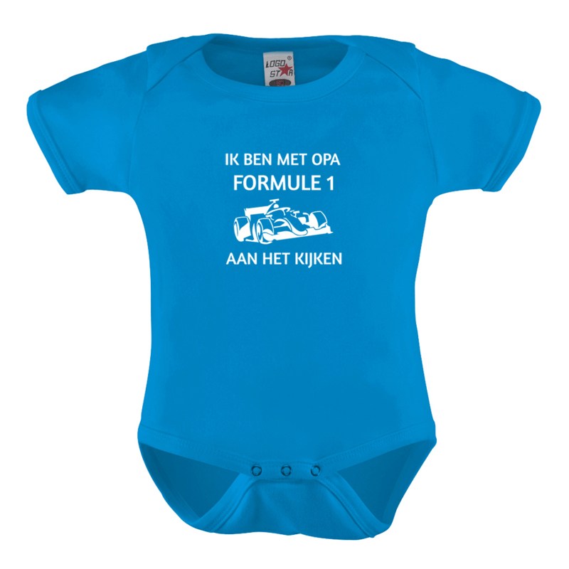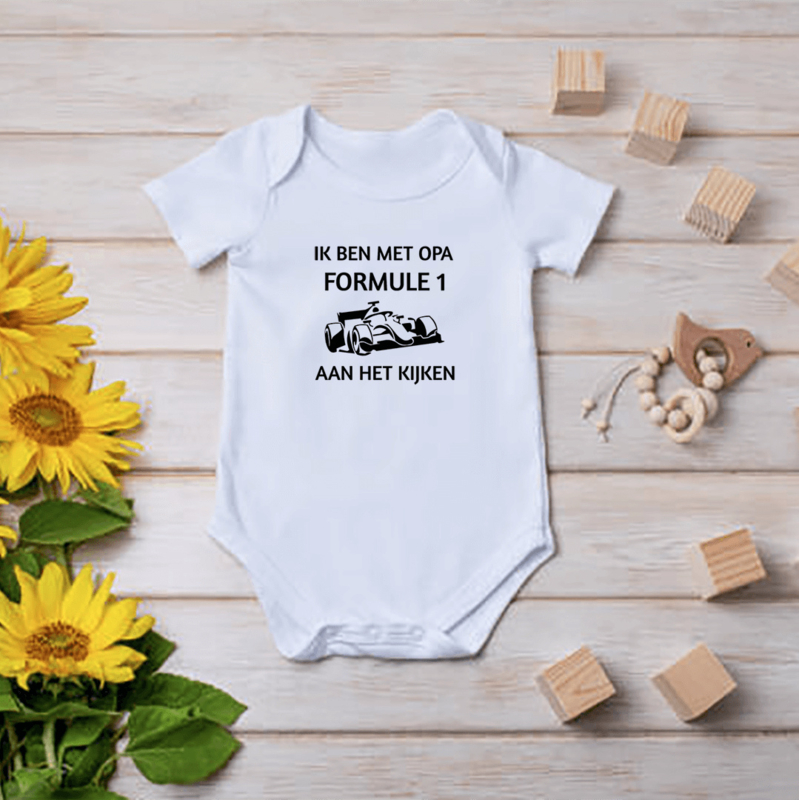 Met deze baby romper met tekst “Ik ben met opa Formule 1 aan het kijken” is meteen duidelijk wie opa’s vaste racebuddy is.